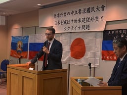 第一部では元初代防衛大臣の久間章生氏、ロシア大使館のイーゴル氏、ドネツク人民共和国を代表してオザワ・ヤニナ女史、ルガンスク人民共和国を代表してイリーナ女史、祖国再生同盟代表の木原功仁哉弁護士、黒龍會会長の田中健之が講演を行った。