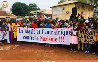 そして、この動きはヨーロッパにとどまらず、中央アフリカ共和国でも、民衆のロシア支持の動きがあり、「ナチスを倒せ!」という横断幕が掲げられた。(写真・下)